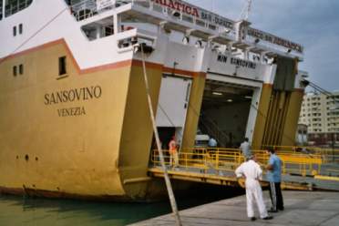 Nach einer Pizza Margeritha in der Fussgängerzone von Bari mache ich mich auf den Weg zum Fährhafen. Man hat mir gesagt, dass vom Bahnhofplatz ein Bus zum Hafen fährt. Ich mache mich also auf die Suche. Beim Bahnhof treffe ich auf eine Gruppe Gastarbeiter, die mit viel Gepäck einen Bus besteigen. Hier werde ich also schon richtig sein. Im Fährhafen angekommen stürze ich mich ins Getümmel um das Fährticket gegen eine Einsteigekarte umzutauschen und die Hafengebühr zu bezahlen. Danach heisst es für die Passkontrolle anstehen. An Bord angekommen beziehe ich meine Kabine. Die meisten Passagiere scheinen jedoch nur eine einfache Deckpassage gebucht zu haben und suchen sich nun ein bequemes Plätzchen für die Ueberfahrt. Nach 23.00 Uhr sind alle Fahrzeuge verladen und die Ueberfahrt kann beginnen.